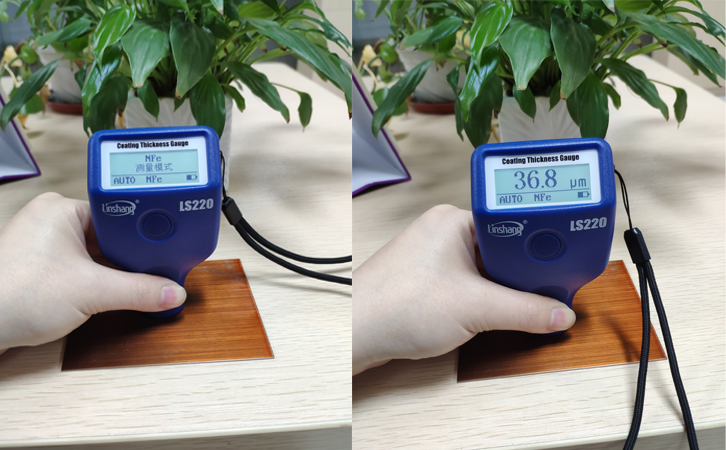 將高精度涂層測厚儀垂直按壓在被測材料上,如圖左邊所示,儀器識別到被測材料為非鐵,提起儀器,LS220會快速自動轉換到非鐵測量模式,再將儀器垂直按壓在被測材料上,即如圖右邊所示,測出了該材料的涂層厚度為36.8μm。